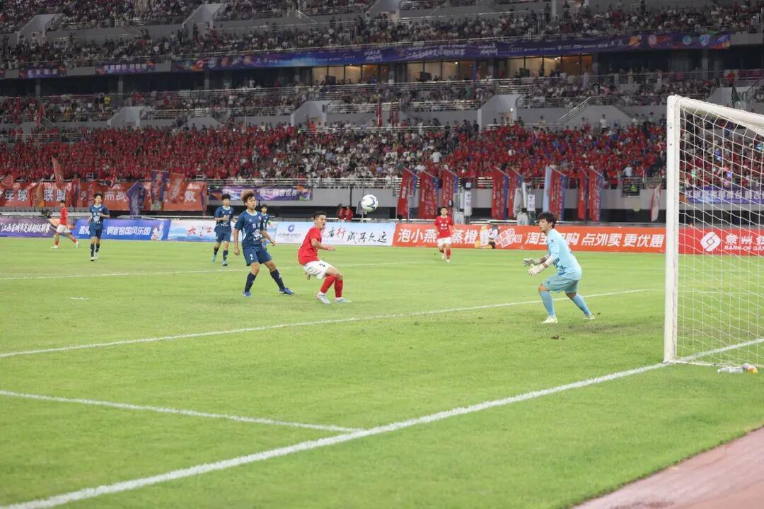 比赛第34分钟,吉安队47号易卓霖禁区拿球后,分给左路44号刘小泉,刘小泉冷静施射,扳回一球,比分来到1:2。